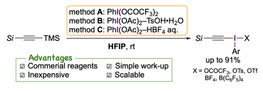Practical method for the synthesis of β-[(trimethylsilyl)ethynyl]-λ3-iodane (HI-12493ZP) Kaede Watanabe, Koki Kawashima, Kazuki Kobayashi, Mutsumi Kimura, Masanobu Uchiyama and Kazunori Miyamoto DOI: https://doi.org/10.24820/ark.5550190.p012.493 Full Text: PDF (662K) received Nov 14 2025; accepted Jan 6 2026;