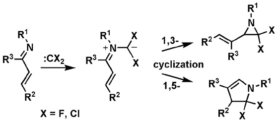 1,3- vs. 1,5-cyclization of azomethine ylides derived from 1-azabuta-1,3-dienes and difluoro- and dichlorocarbenes. Experimental and quantum-chemical study (OK-2938AP)